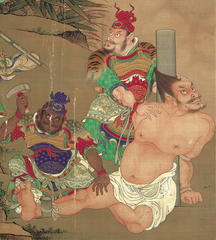 《关羽擒将图》描述的是三国时“水淹七军,活捉庞德”故事。画中的庞德虽然被擒,但心中不服,怒睁双目、咬紧钢牙、咆哮挣扎,几近全裸的身体正可表现庞德雄壮的体魄。二员裨将一按住庞德,一正加紧钉敲木桩以捆缚庞德(否则真难制服庞德)。关平欲拔佩剑,周仓厉声喝斥,两人高度警惕,随时准备应付突发事件。而关羽相对轻松,坐于山石之上,正双手抱膝,身体略向前倾,美髯拂动,气宇轩昂,正注视着庞德的一举一动。
